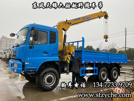 東風(fēng)天錦六驅(qū)隨車吊詳細(xì)參數(shù)配置:東風(fēng)天錦D530一排半駕駛室?guī)Э照{(diào),6×6驅(qū)動(dòng),康明斯ISDe270 30,國三排放標(biāo)準(zhǔn)發(fā)動(dòng)機(jī),法士特8JS118變速箱,ZQC1200(機(jī)械式)分動(dòng)箱,前橋6噸,10噸雙后橋,大江車橋輪邊減速,12.5R20越野輪胎帶備胎,軸距4100+1300mm,大梁280mm,電動(dòng)玻璃,方向助力,斷氣剎,大箱尺寸5000×2400×600mm,底板采用4mm花紋板,采用徐工原廠5噸3節(jié)臂隨車起重運(yùn)輸機(jī)。