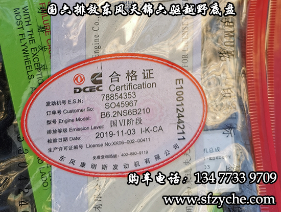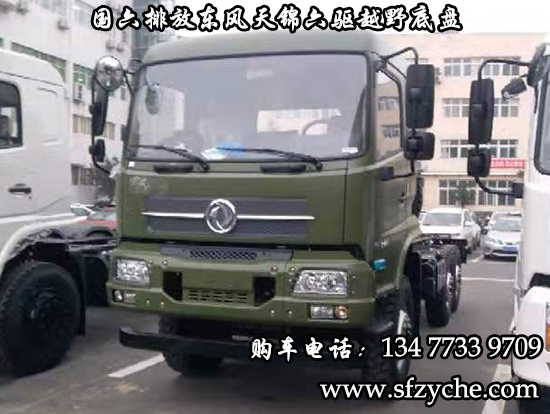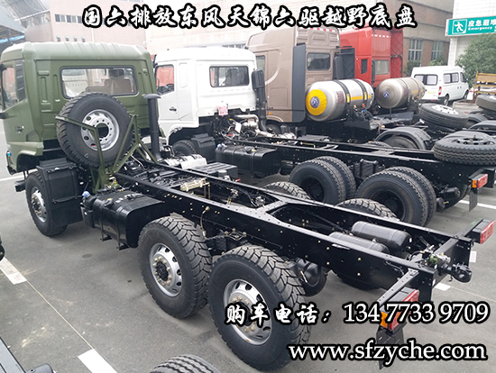 國六排放東風(fēng)天錦六驅(qū)越野底盤,東風(fēng)天錦D530一排半駕駛室,6×6驅(qū)動(dòng),康明斯B6.2NS6B210國六發(fā)動(dòng)機(jī)210馬力,最大扭矩:850N.m/1100-1700rpm,排量6.2L、韶齒手動(dòng)六檔變速箱,東風(fēng)德納車橋,前驅(qū)動(dòng)橋4.5噸,中后橋都為軍工德納4.5噸驅(qū)動(dòng)橋,大花紋越野輪胎,軸距3500+1250mm,電動(dòng)玻璃,方向助力,斷氣剎,ABS,大燈自動(dòng)調(diào)節(jié),自動(dòng)調(diào)整臂,選裝原廠空調(diào)。