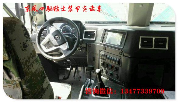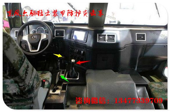 上圖是6輪驅(qū)動長軸2代猛士裝甲車駕駛艙特寫。較1代猛士裝甲車有24處改進(jìn)。諸如:粗握把3幅面方向盤可以減緩駕駛員操作時的疲勞程度(1代猛士的方向盤為細(xì)握把,駕駛時間超過2小時手掌酸痛)。全新的組合儀表,將發(fā)動機(jī)轉(zhuǎn)速、車速、發(fā)動機(jī)水溫、機(jī)油壓力、蓄電池電壓顯示的更加清晰。各個功能按鍵全部改為由上至下按壓式大尺寸開關(guān)。而輪胎壓力調(diào)節(jié)開關(guān)從儀表臺左下側(cè)轉(zhuǎn)移至右側(cè)(此處改進(jìn)有助于駕駛員快速操控)。