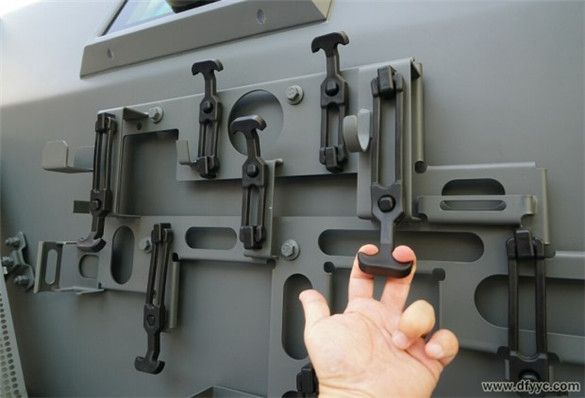 上圖是東風(fēng)四驅(qū)防雷反恐戰(zhàn)車右前側(cè)圍懸掛附加工具或補(bǔ)給品的懸掛特寫。用手較費(fèi)勁的抻拉橡膠懸掛鎖具。備用工具通過(guò)橡膠掛具與背板固定在車身側(cè)面,背板拆卸后可以成為盤等工具。