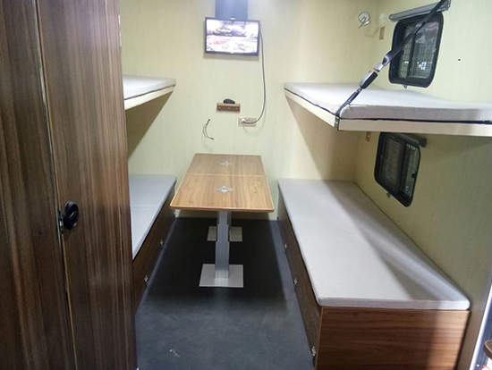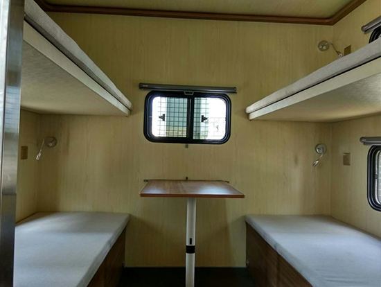 3、休息區(qū)備有4個上下鋪8個床位,配有床墊,每個上下床鋪依靠的墻壁上都有一個風(fēng)景透氣窗。每個床鋪下面設(shè)一組附件柜,床位兩側(cè)上方各配衣帽鉤、插座和可調(diào)節(jié)床頭燈,休息區(qū)配有19寸液晶電視一臺及空調(diào)一部。