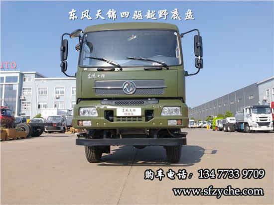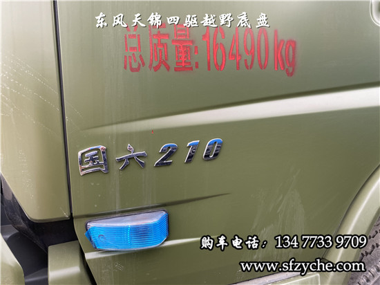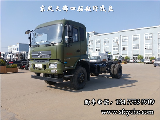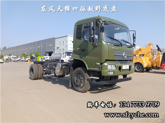 國(guó)六排放天錦(4×4)越野底盤,采用DFV2163GP6DJ型國(guó)六排放東風(fēng)天錦四驅(qū)越野底盤,東風(fēng)天錦D530一排半駕駛室,4×4驅(qū)動(dòng),康明斯B6.2NS6B210國(guó)六發(fā)動(dòng)機(jī)210馬力,最大扭矩:850N.m/1100-1700rpm,排量6.2L、韶齒手動(dòng)六檔變速箱,東風(fēng)德納車橋,前驅(qū)動(dòng)橋4.5噸,后橋10噸,10.00R20輪胎,軸距4500mm/4700mm,大梁280mm,電動(dòng)玻璃,方向助力,斷氣剎,ABS,大燈自動(dòng)調(diào)節(jié),自動(dòng)調(diào)整臂,選裝原廠空調(diào)。