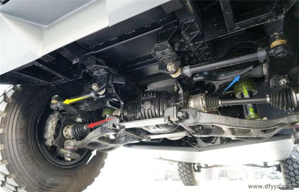 東風(fēng)四驅(qū)裝甲防雷反恐戰(zhàn)車為前置動(dòng)力、實(shí)時(shí)四輪驅(qū)動(dòng)設(shè)定,縱置發(fā)動(dòng)機(jī)(白色箭頭)直接與變速器(綠色箭頭)剛性連接,通過中間傳動(dòng)軸(黃色箭頭)至分動(dòng)器,在經(jīng)過前傳動(dòng)軸(紅色箭頭)與后傳動(dòng)軸將動(dòng)力輸出至前后驅(qū)動(dòng)橋。